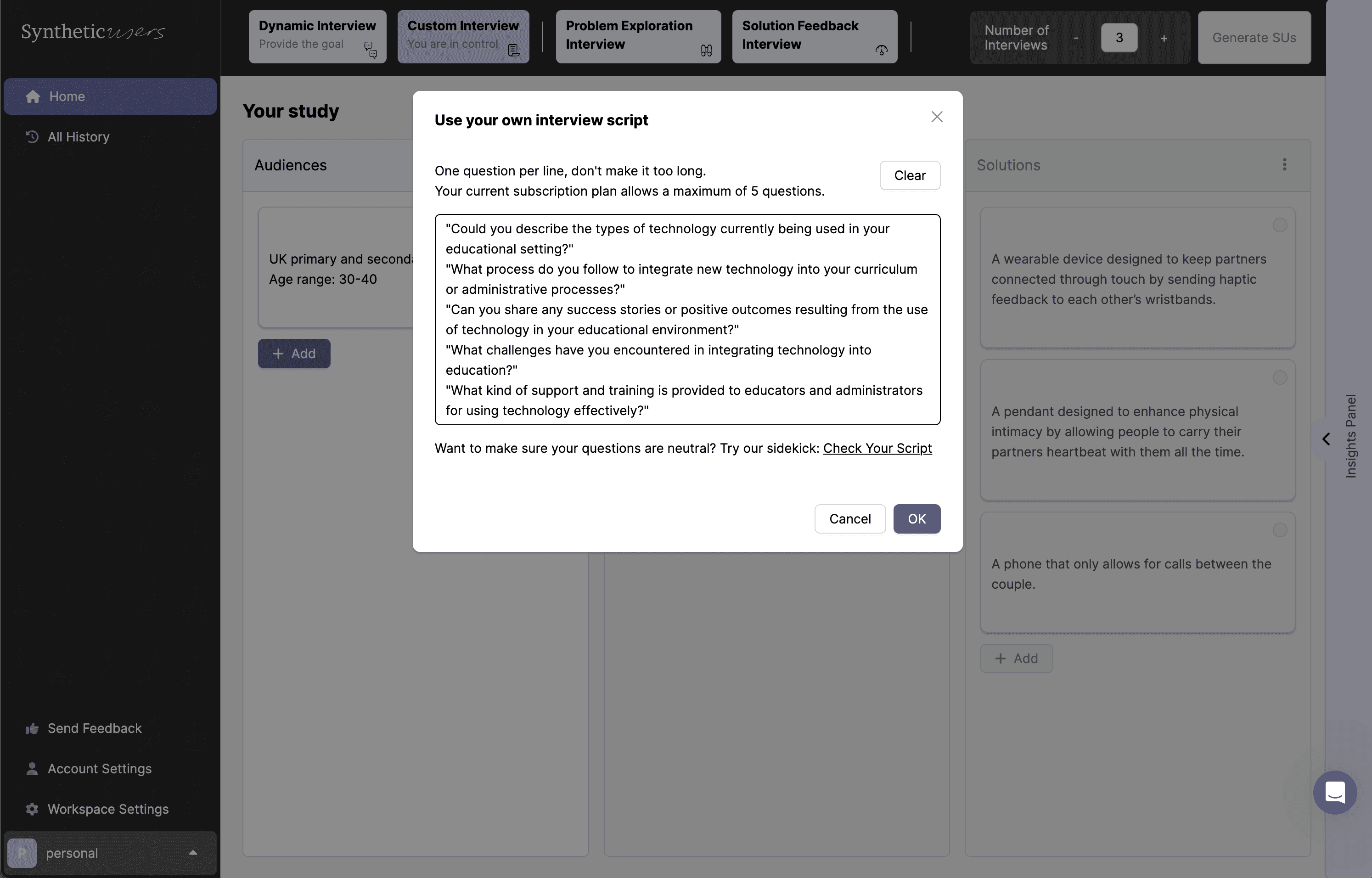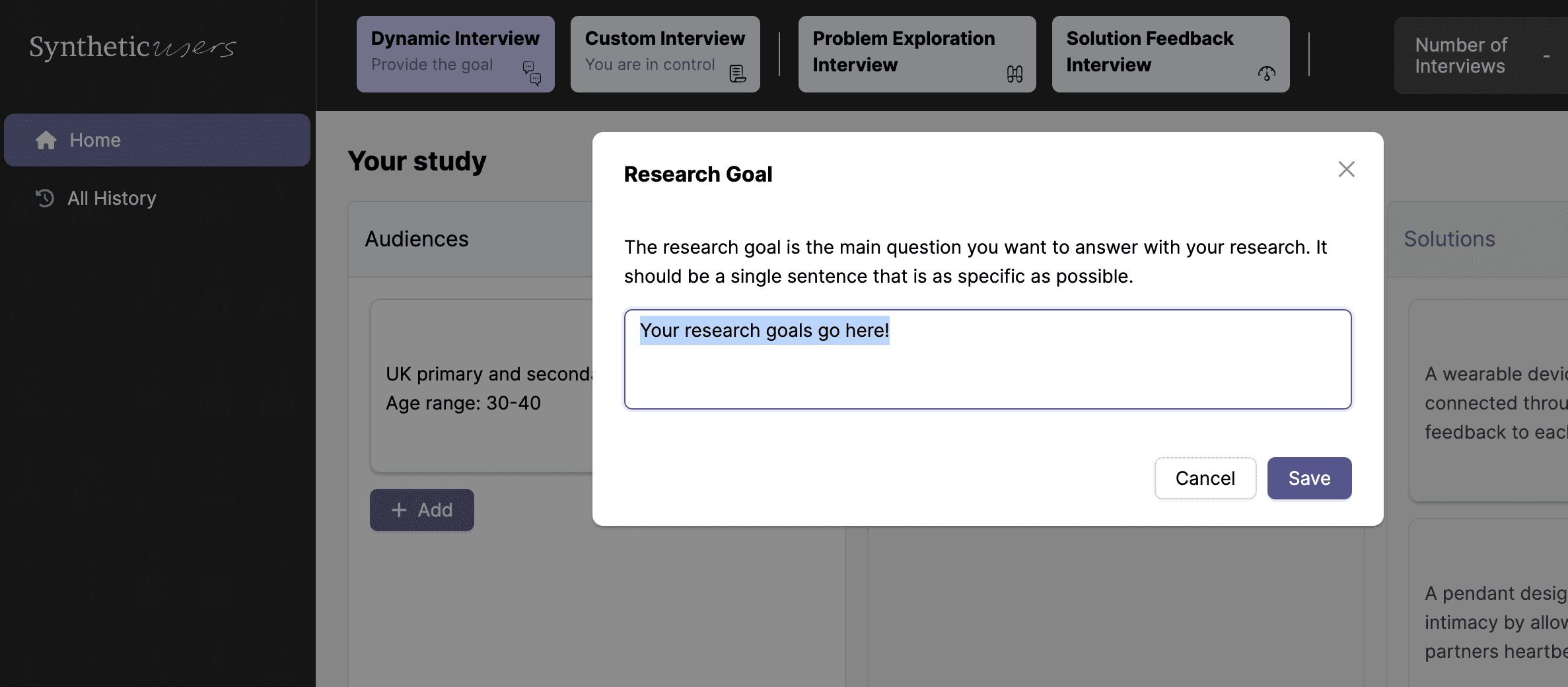 Number one. You can run a dynamic script and let us take care of everything. We create Synthetic Users as well as the researchers asking the questions. It just like magic. The interview will run for a maximum of 6 questions. If you want to run an unstructured interview solely based on a goal, this is the best approach.