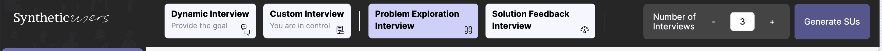 Depending on your research goal, whether or not you already have an interview script or if you already have a clear solution you wish to test, Synthetic Users have a number of options for you.