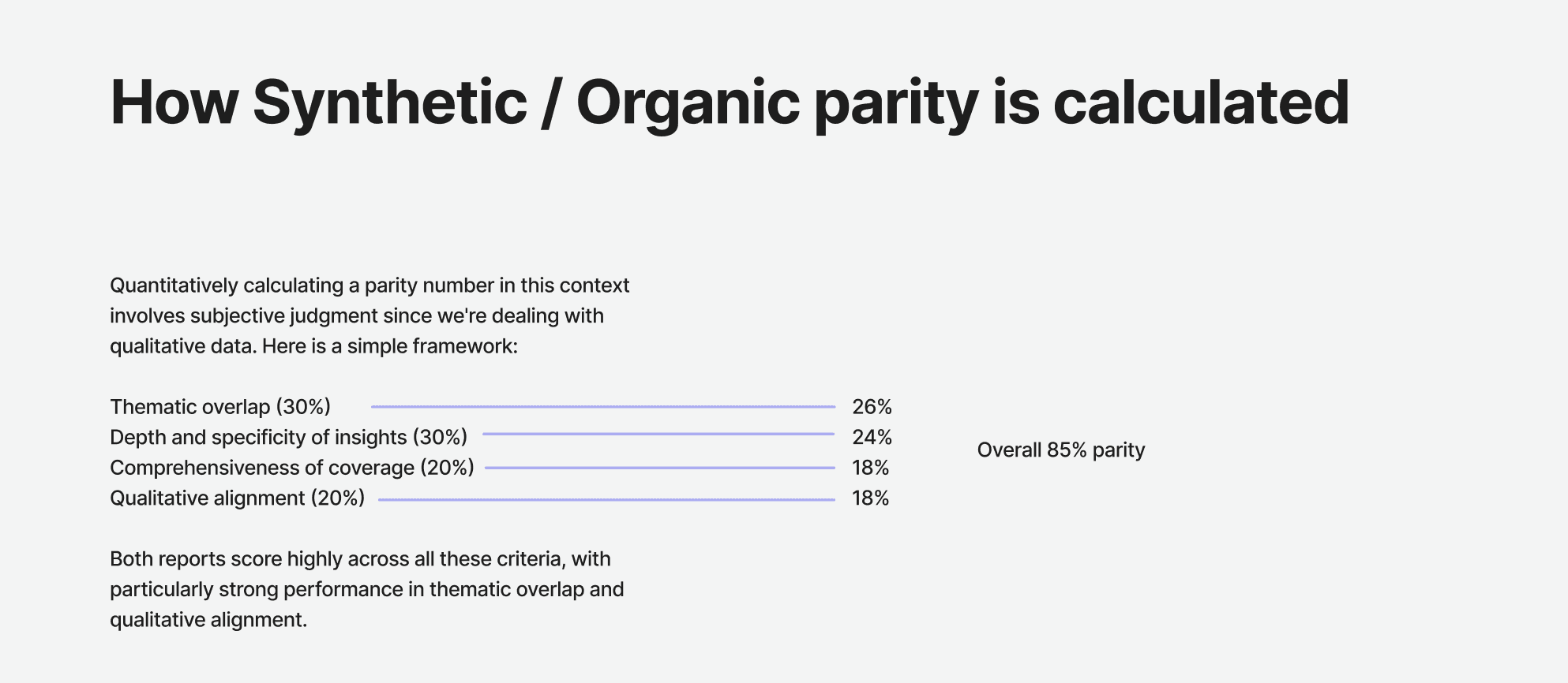 This is what we tell all our users when they are starting out. Try it, compare it with an existing study. Put the Synthetic interviews next to the organic and see how comfortable you feel about it.