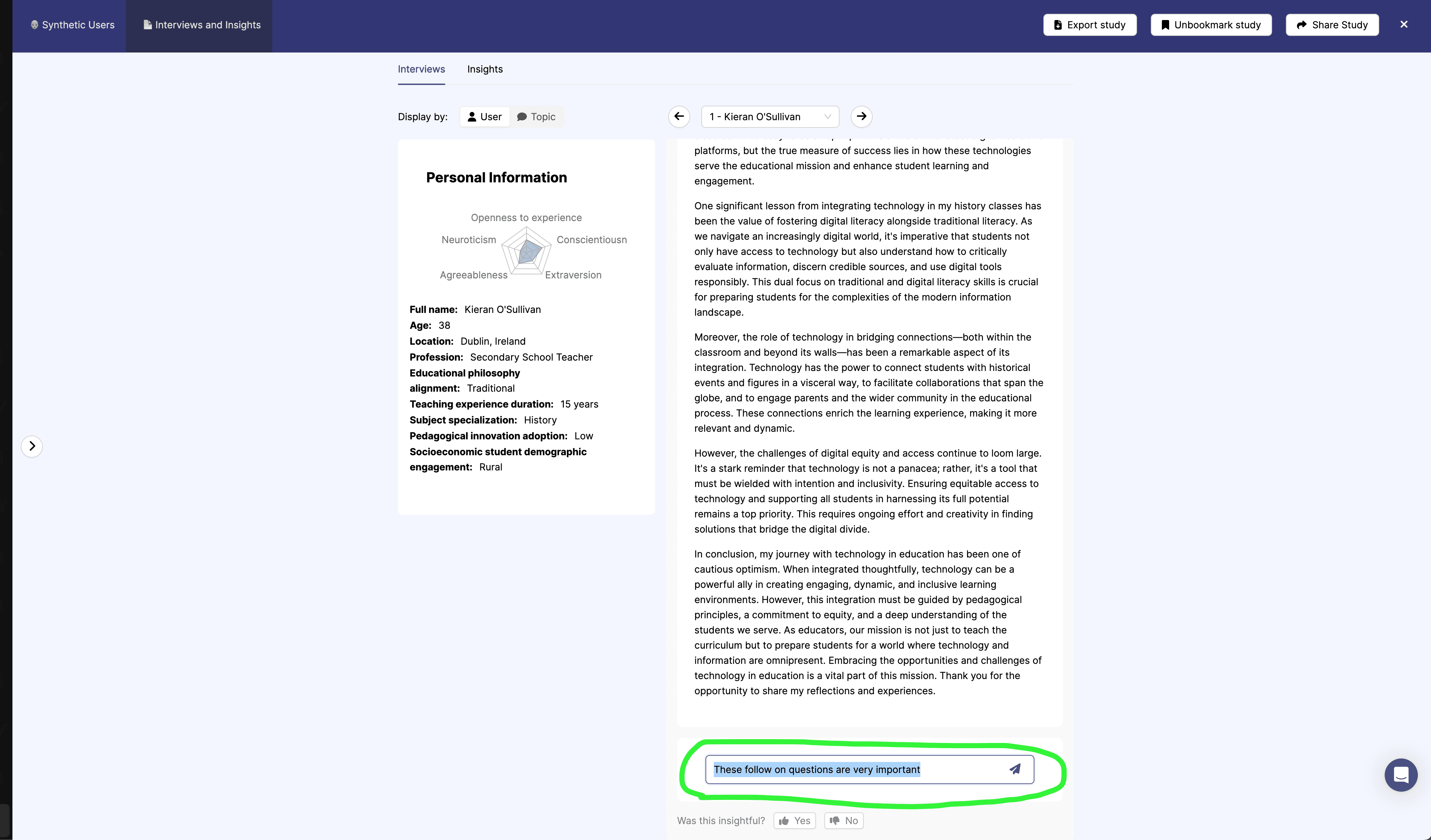 Follow on questions are really important. Don’t just give up at the first glance. Unlike with organic interviews, with Synthetic Users you can ask follow on questions. Drill down into areas where you feel the answers are too generalist.