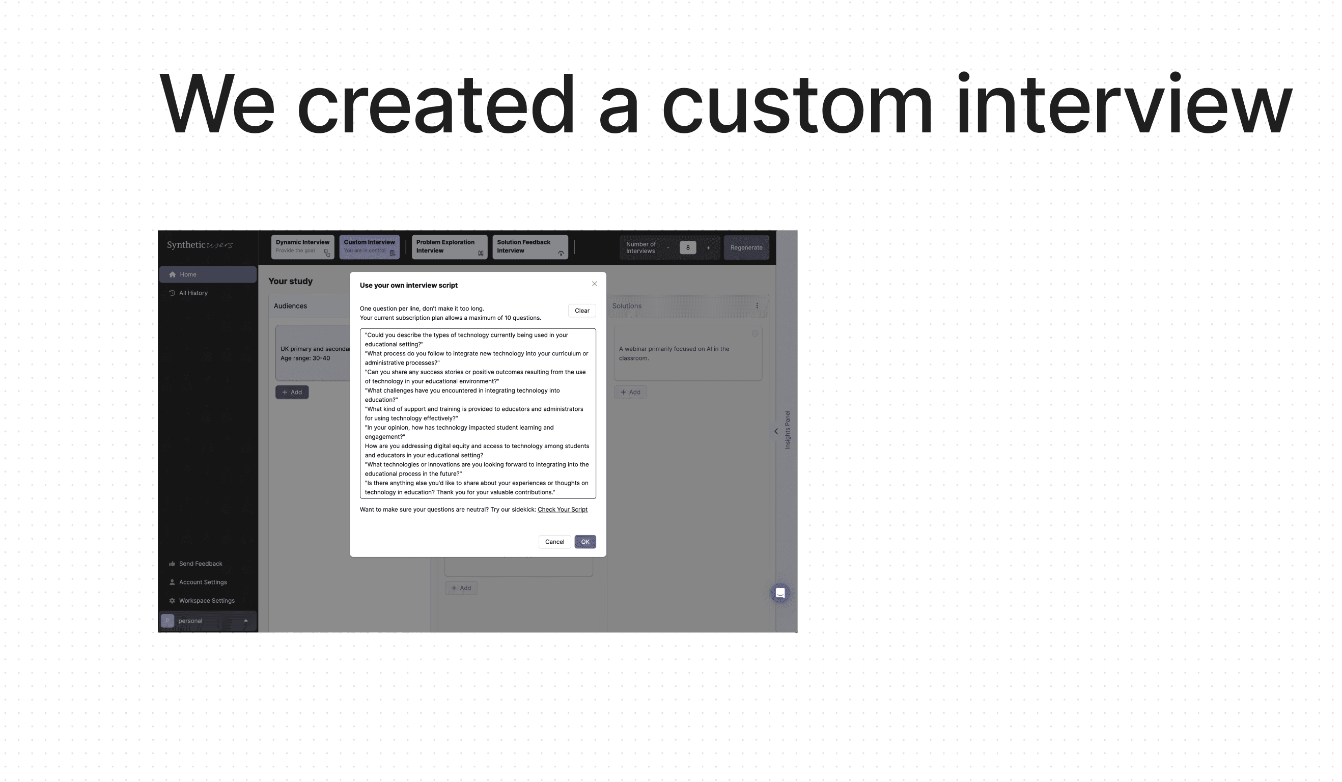 Step 4: We run the same interview script, using a Custom Interview within Synthetic Users