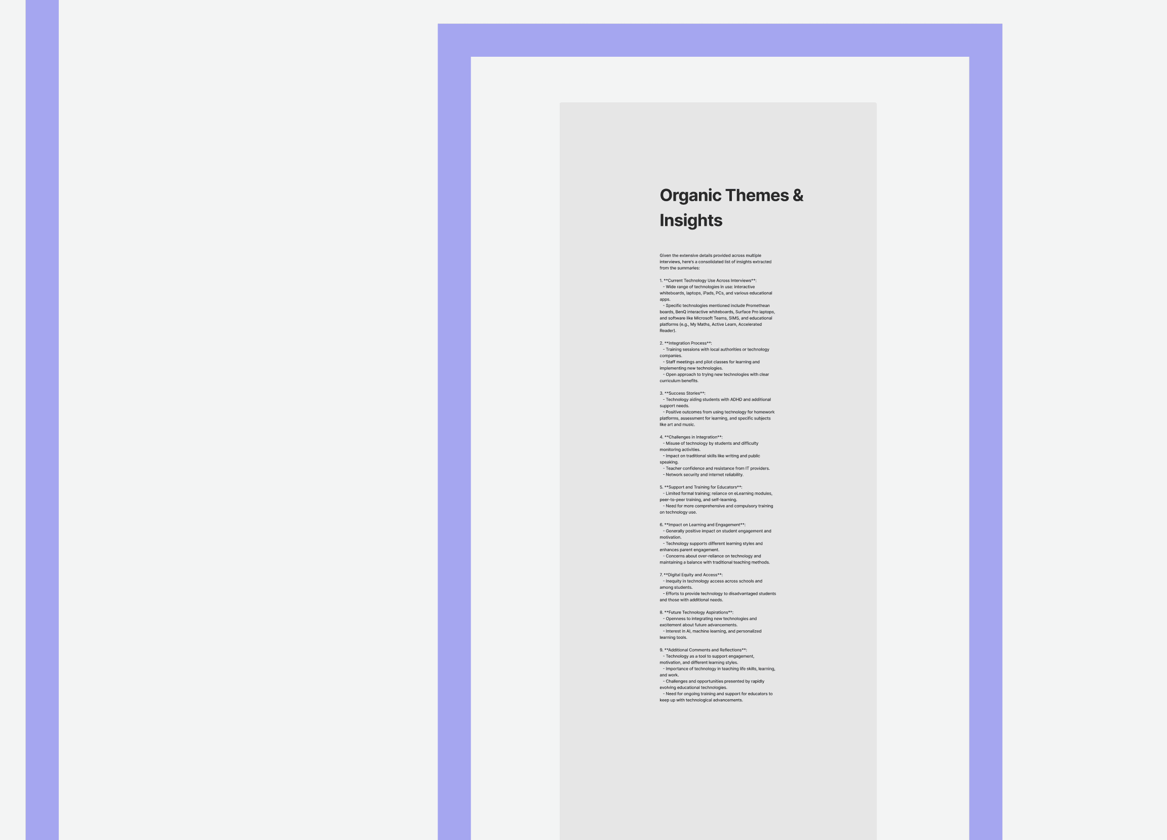 Thematic Overlap: Both reports cover essentially the same themes, including the use of technology, integration challenges, support and training, impact on learning, digital equity, and future aspirations. This comprehensive thematic overlap is a strong indicator of alignment in the core areas of interest.